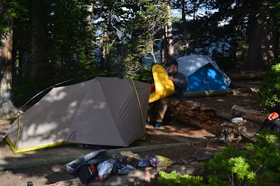 That little game ended shortly thereafter when the true climbing began. Here's our first night's campsite at Marion Lake. The next couple pictures are the views past those trees. Outstanding! I could brush my teeth standing at the edge of that cliff every morning for the rest of my life. Just beautiful!